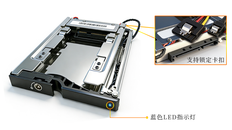 前置独立LED指示灯,便于用户实时掌握硬盘工作状态;数据线与电源线均采用扣锁式接口设计(SATA 7 Pin + 15 Pin),可有效防止因振动或误触导致的线材脱落,连接后即保持锁定,确保持久稳定的信号与供电传输。